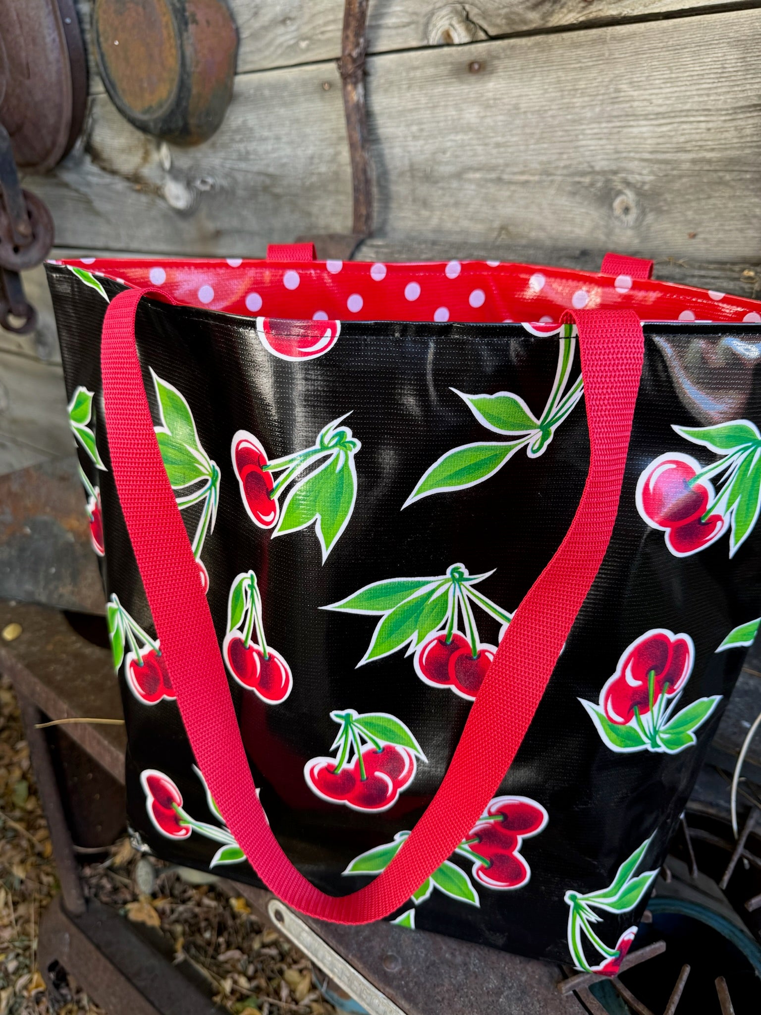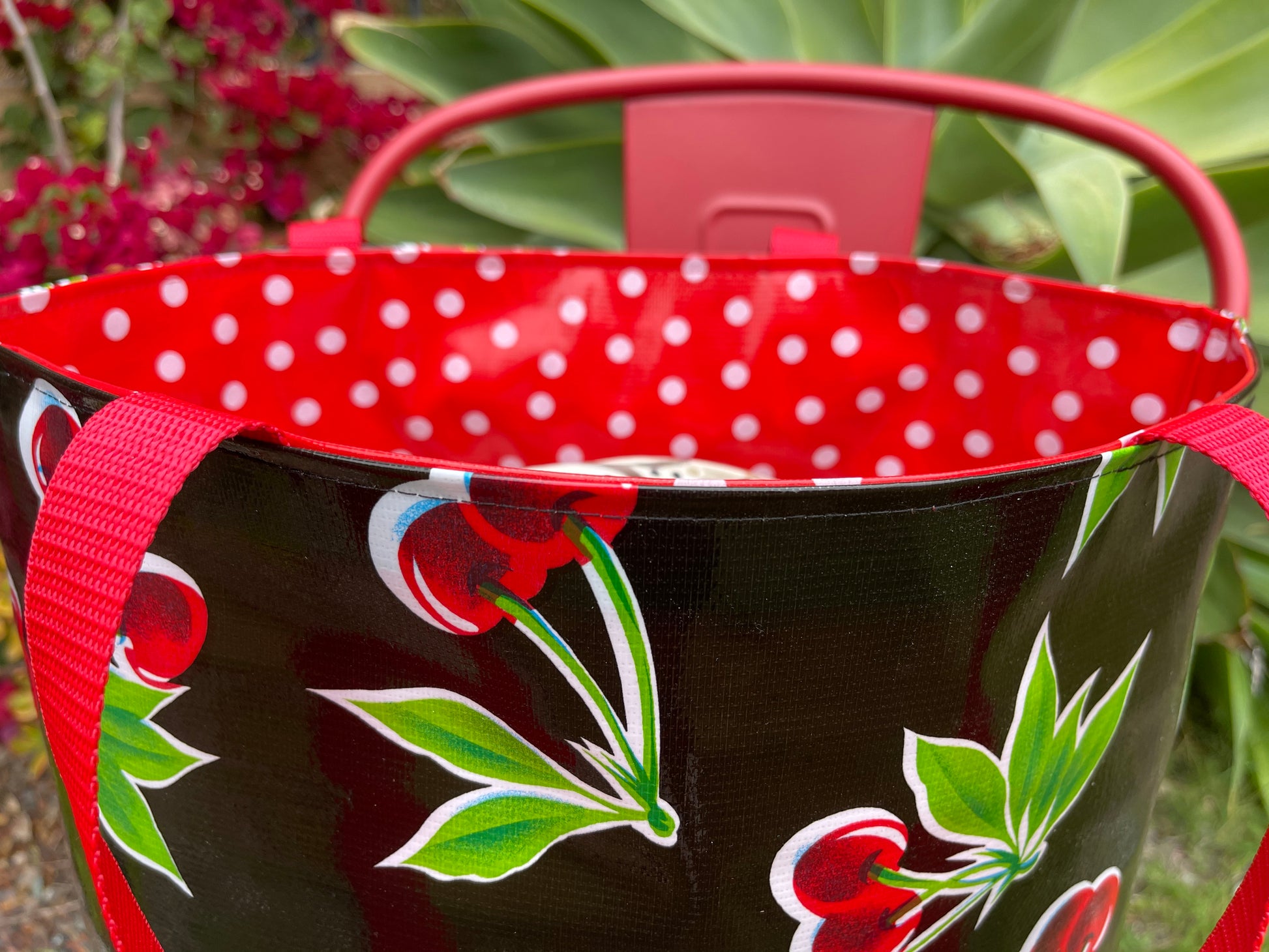 Reversible Oilcloth Totebag - Black Cherry with White on Red Polka - Two Sizes