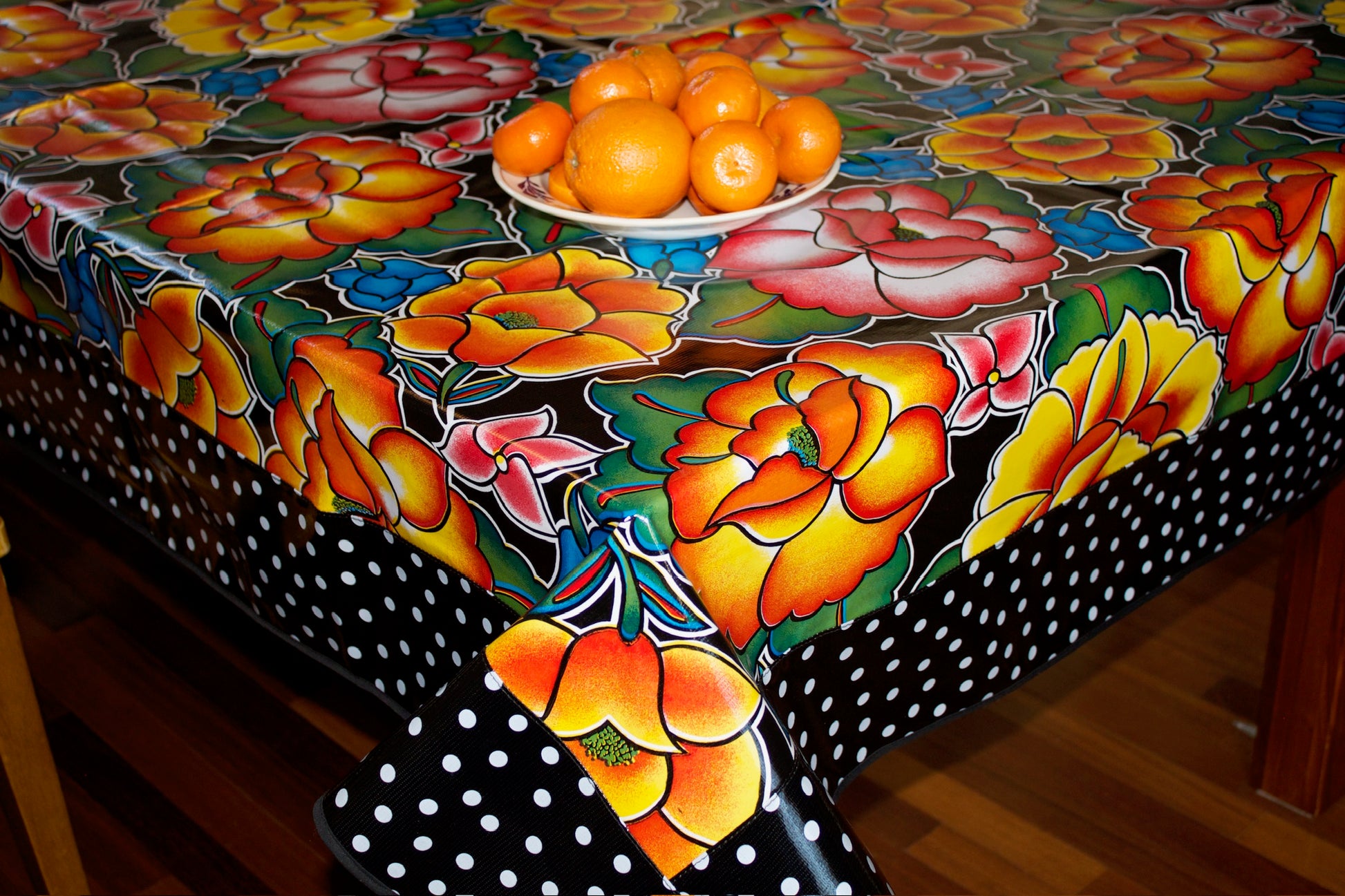 Add bold elegance to your table with our Black Royal Roses tablecloth. Featuring a stunning display of vibrant orange, pink, and yellow roses set against a dramatic black background, this design exudes sophistication and charm. The vivid floral pattern pops beautifully, while the playful black and white polka dot border adds a whimsical touch. Perfect for special occasions, festive gatherings, or simply brightening up everyday meals, this durable, easy-to-clean oilcloth tablecloth is as practical as it is striking. Let the Black Royal Roses tablecloth transform your dining space into a masterpiece of color and style!