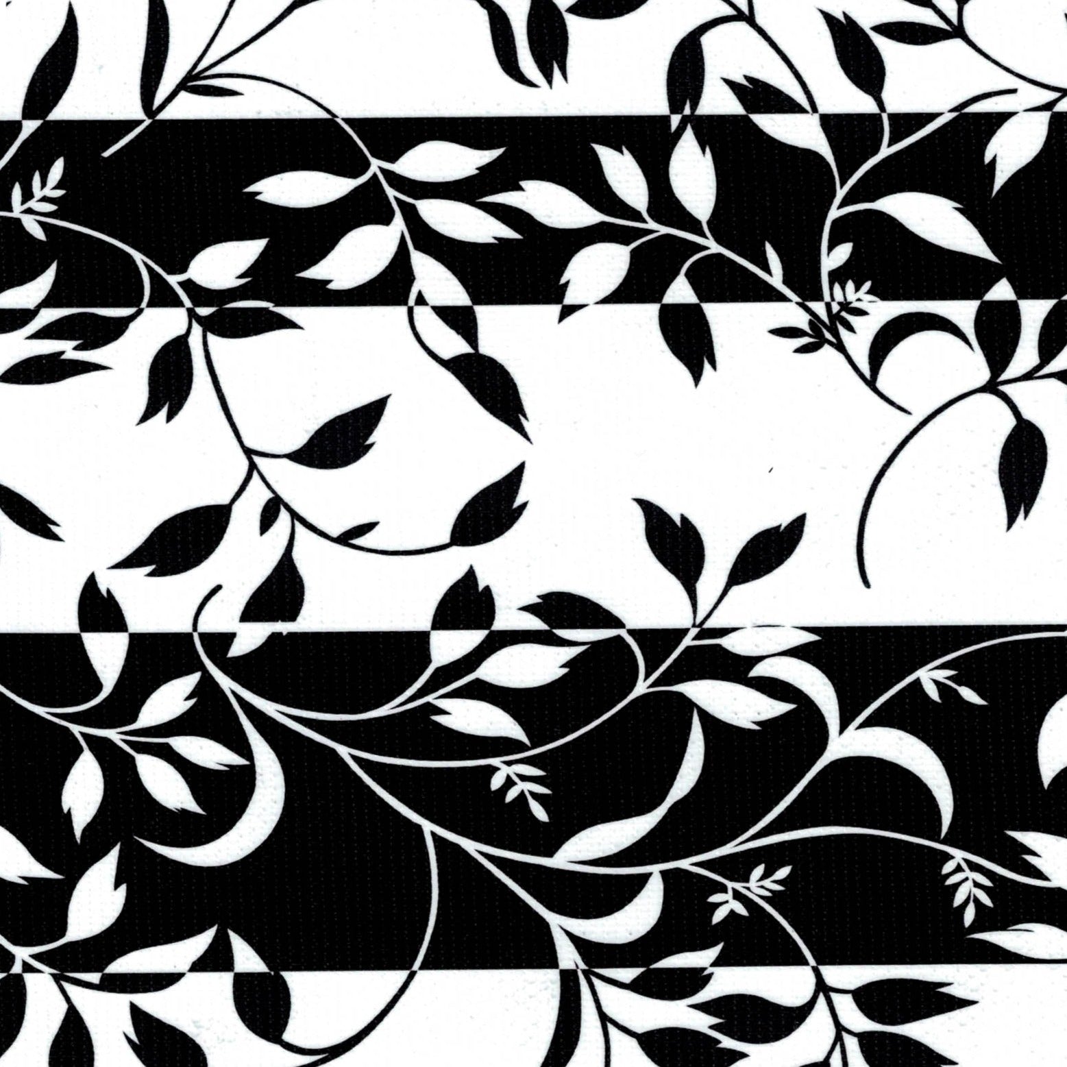 A scrolling vine design on a background of subtle stripes ensures that this print will deliver a statement wherever it's placed in the home. The black and white silhouettes are easy to incorporate alongside a wide variety of home decor. Perfect as a placemat, table runner, or statement piece.