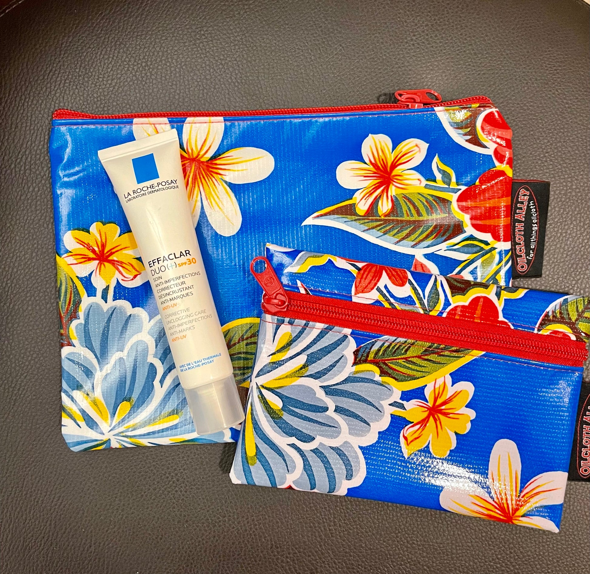 The set includes a medium and small pouch in Blue Hibiscus, lined with White on Red Polka Dot Oilcloth.