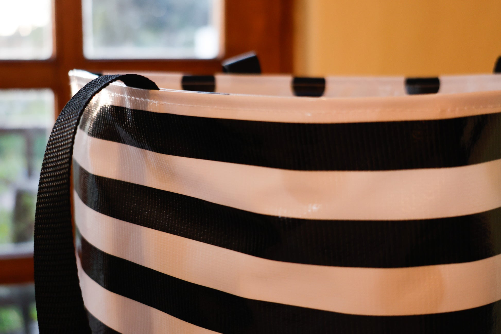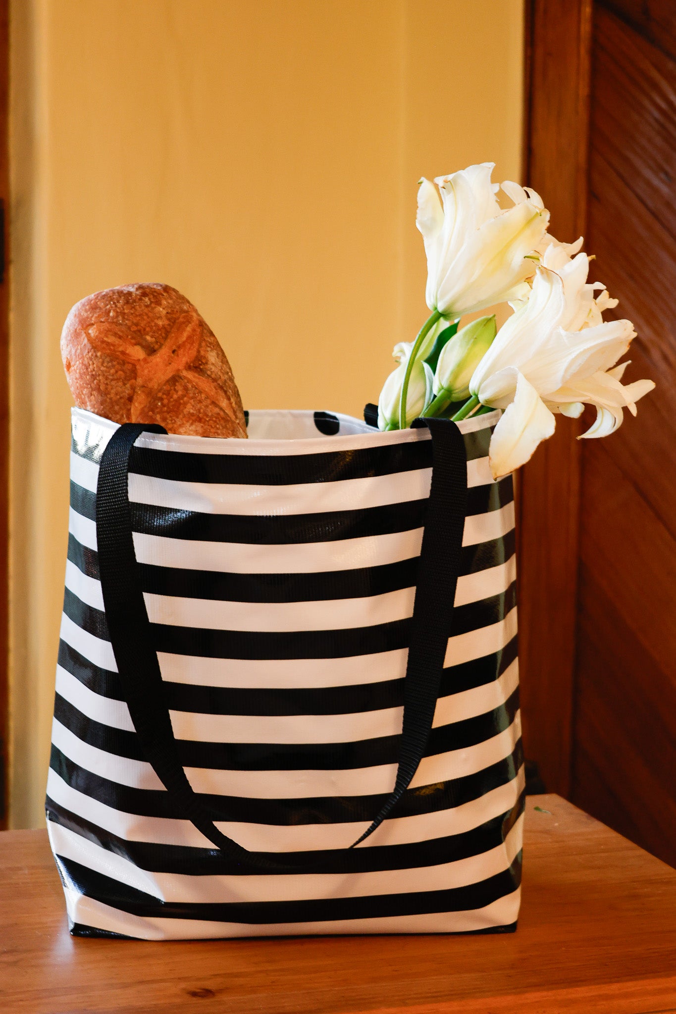 Our signature reversible tote bag will become your favorite bag to bring on the go! It's sturdy, stylish, and easy to clean, making it perfect for groceries, books, or anything you dream of toting around town! This elegant style combines Black and White Stripes with Black and Silver Confetti in two sizes: medium and large.