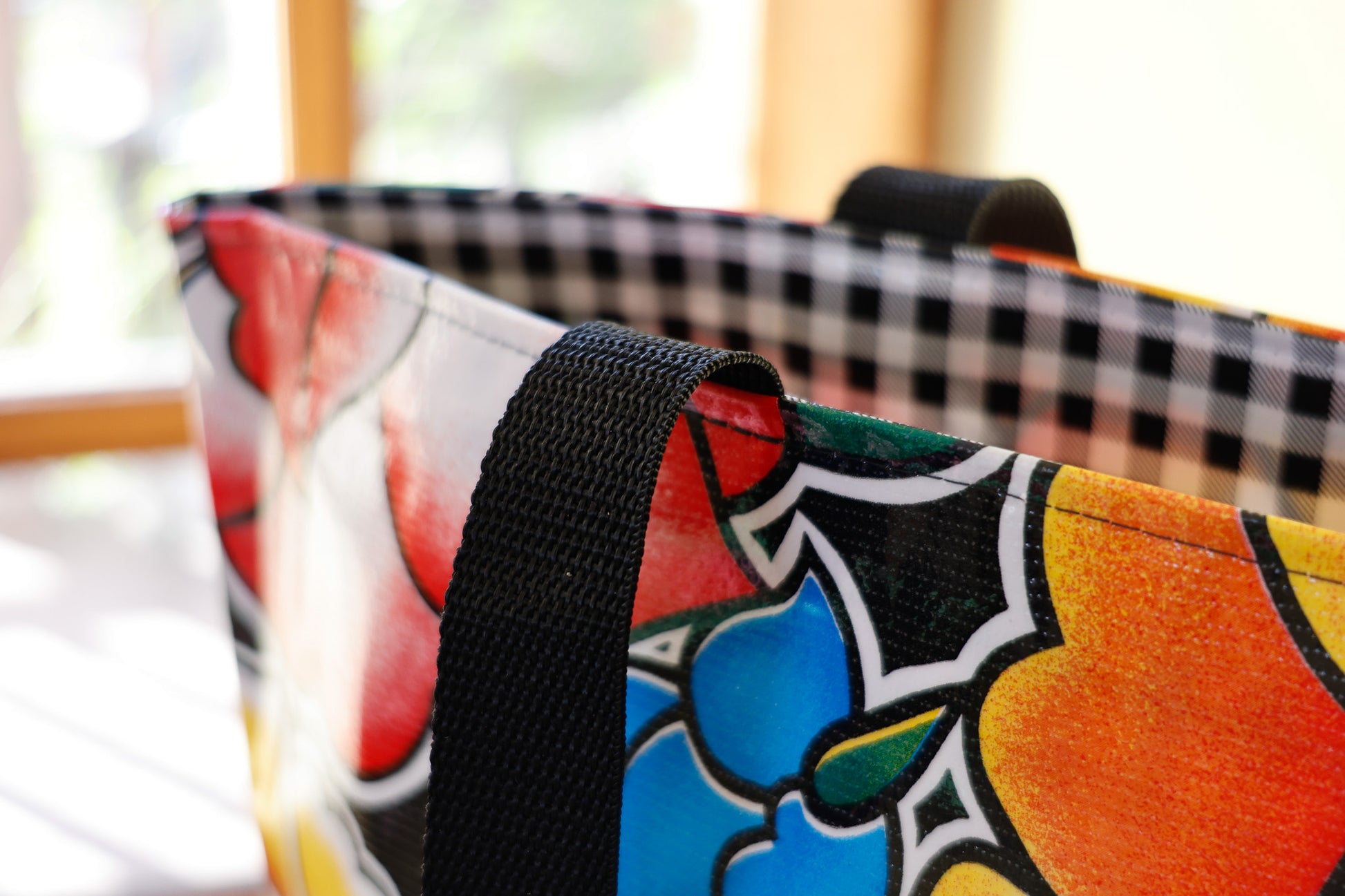 Our signature reversible tote bag will become your favorite bag to bring on the go! It's sturdy, stylish, and easy to clean, making it perfect for groceries, books, or anything you dream of toting around town! This lush floral style combines Black Royal Roses with Black Gingham in two sizes: medium and large.