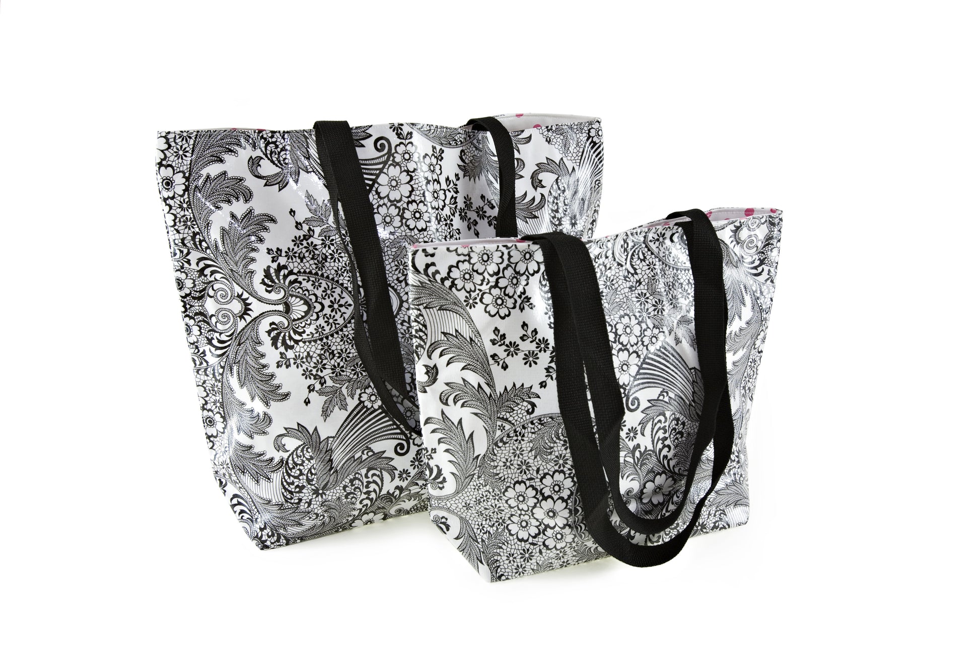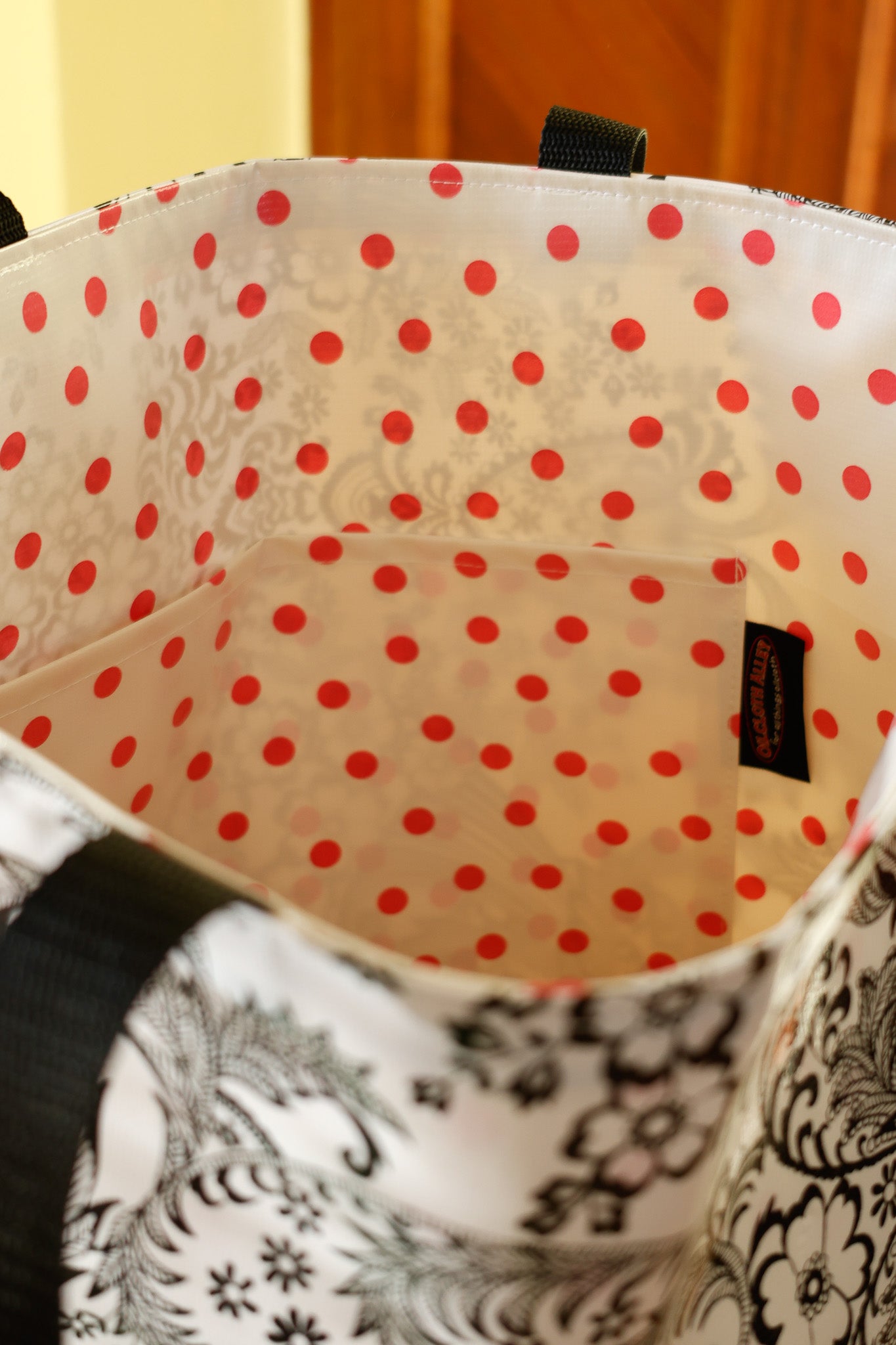 Our signature reversible tote bag will become your favorite bag to bring on the go! It's sturdy, stylish, and easy to clean, making it perfect for groceries, books, or anything you dream of toting around town! This classic style combines Black and White Toile with either Black or Pink Polka Dots in two sizes: medium and large.