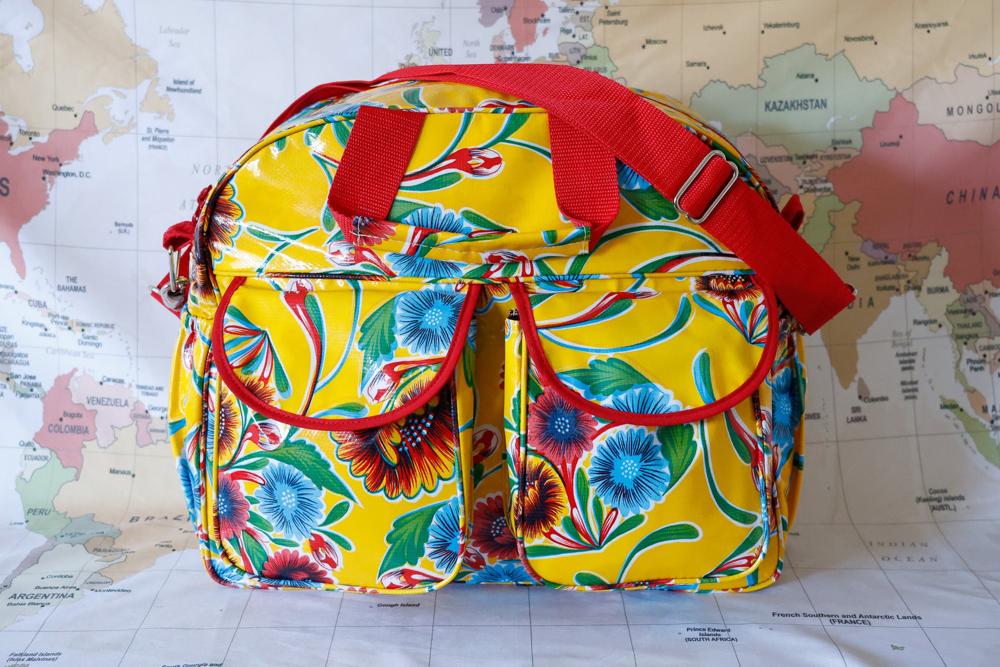 If you're looking for a versatile bag that has built-in organization, this is it! This Oilcloth Carryall Bag is perfect for an overnight getaway, school trip, or plane ride! It holds a surprising amount and has multiple pockets, making it your go-to! Multicolored flowers on a bright yellow background make up our Springbloom! Inside, it's lined with fun white Polka Dots on a red background.