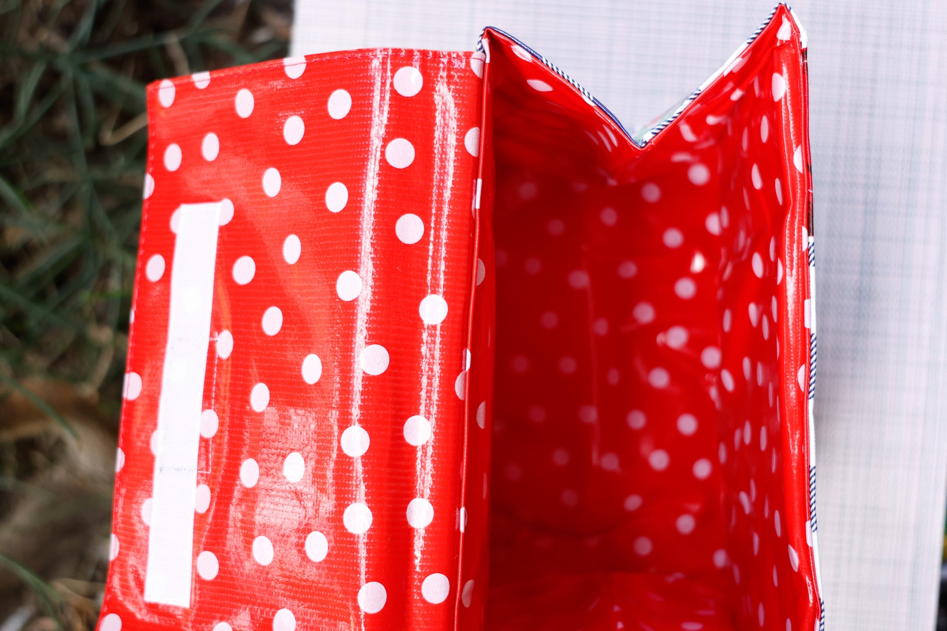 Our oilcloth lunch bags are so cute and convenient, you'll never want to use a paper bag again! They wipe clean with a damp cloth, making messy lunch bags a thing of the past. You'll be the envy of the lunchroom! This style has a Blue Cafe Check with Fruit print with an accent of White on Red Polka Dots.