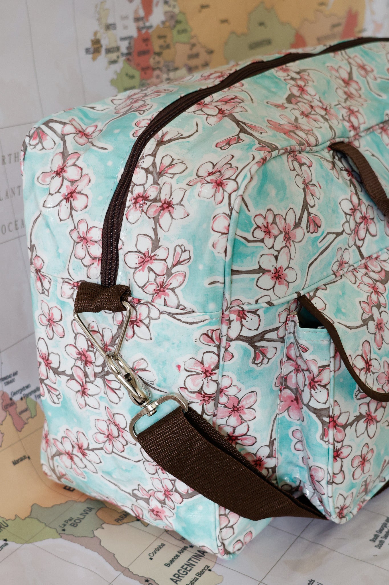 Oilcloth Weekender Bag - Seafoam Cherry Blossom