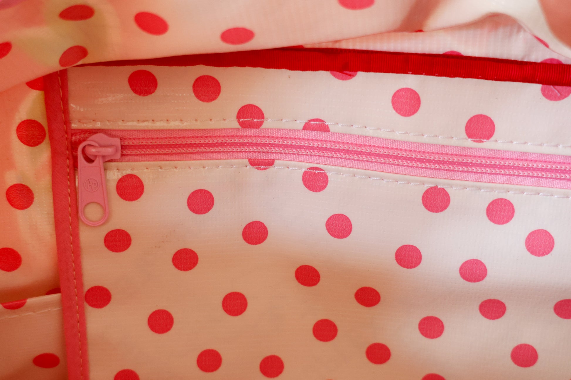 Time for a vacation? Our Weekender bag is luxurious and large, perfect for being on the go. Go vintage with one of our most popular print combination: Pink Cherry oilcloth lined with Pink on Red polka dots!