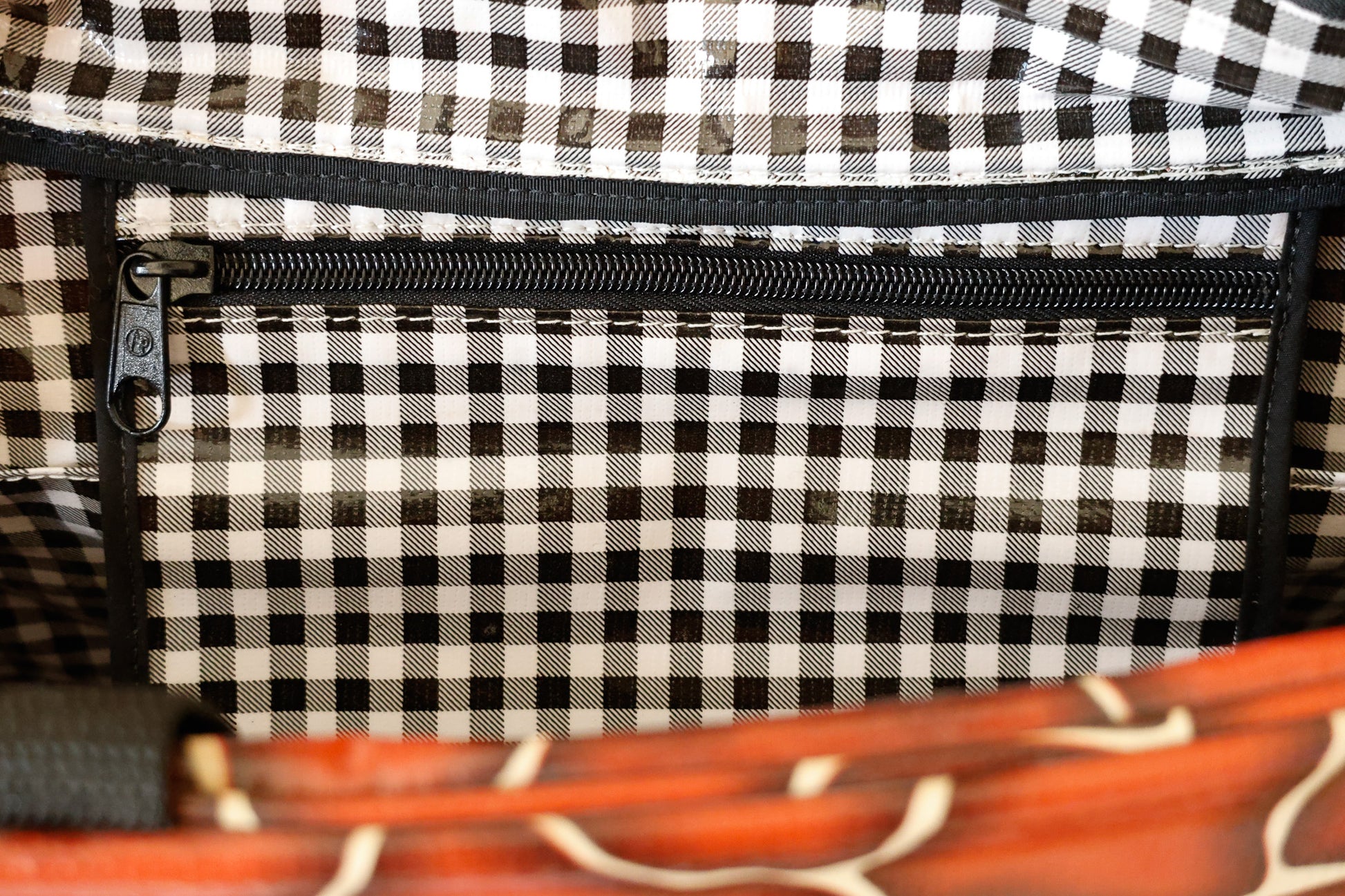 Time for a vacation? Our Weekender bag is luxurious and large, perfect for being on the go. Go wild with a fun combination of Red Giraffe oilcloth lined with Black and White Gingham!