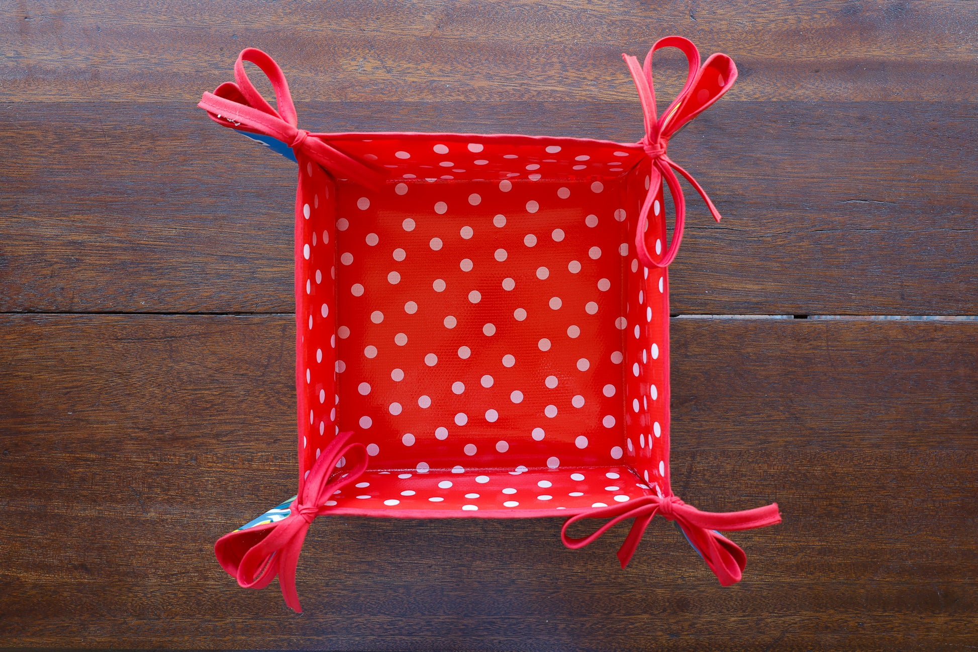 Reversible Oilcloth Basket in Blue Hibiscus and White on Red Polka Dot