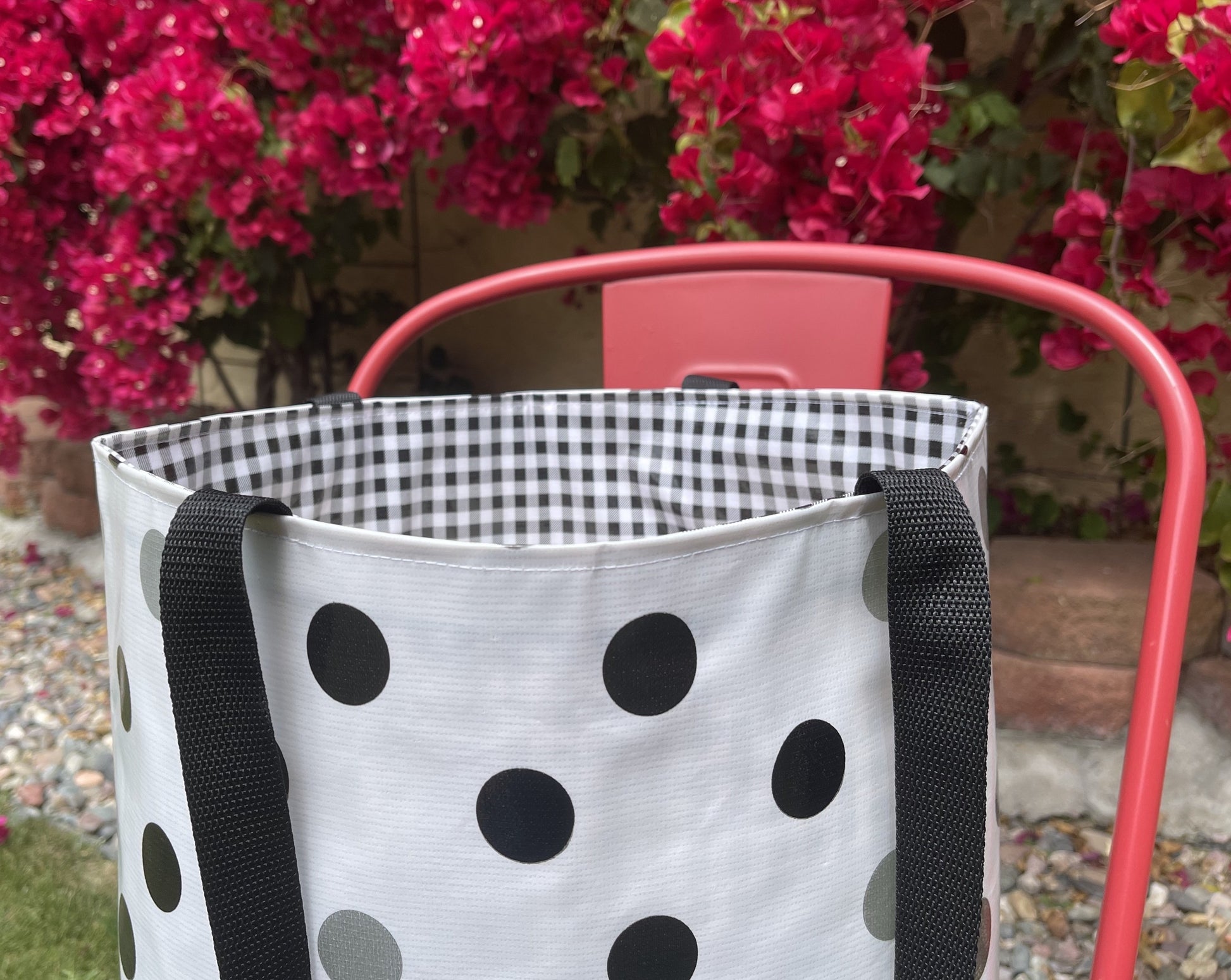 Our signature reversible tote bag will become your favorite bag to bring on the go! It's sturdy, stylish, and easy to clean, making it perfect for groceries, books, or anything you dream of toting around town! This elegant style combines Black and Silver confetti with Black and White Gingham in two sizes: medium and large.