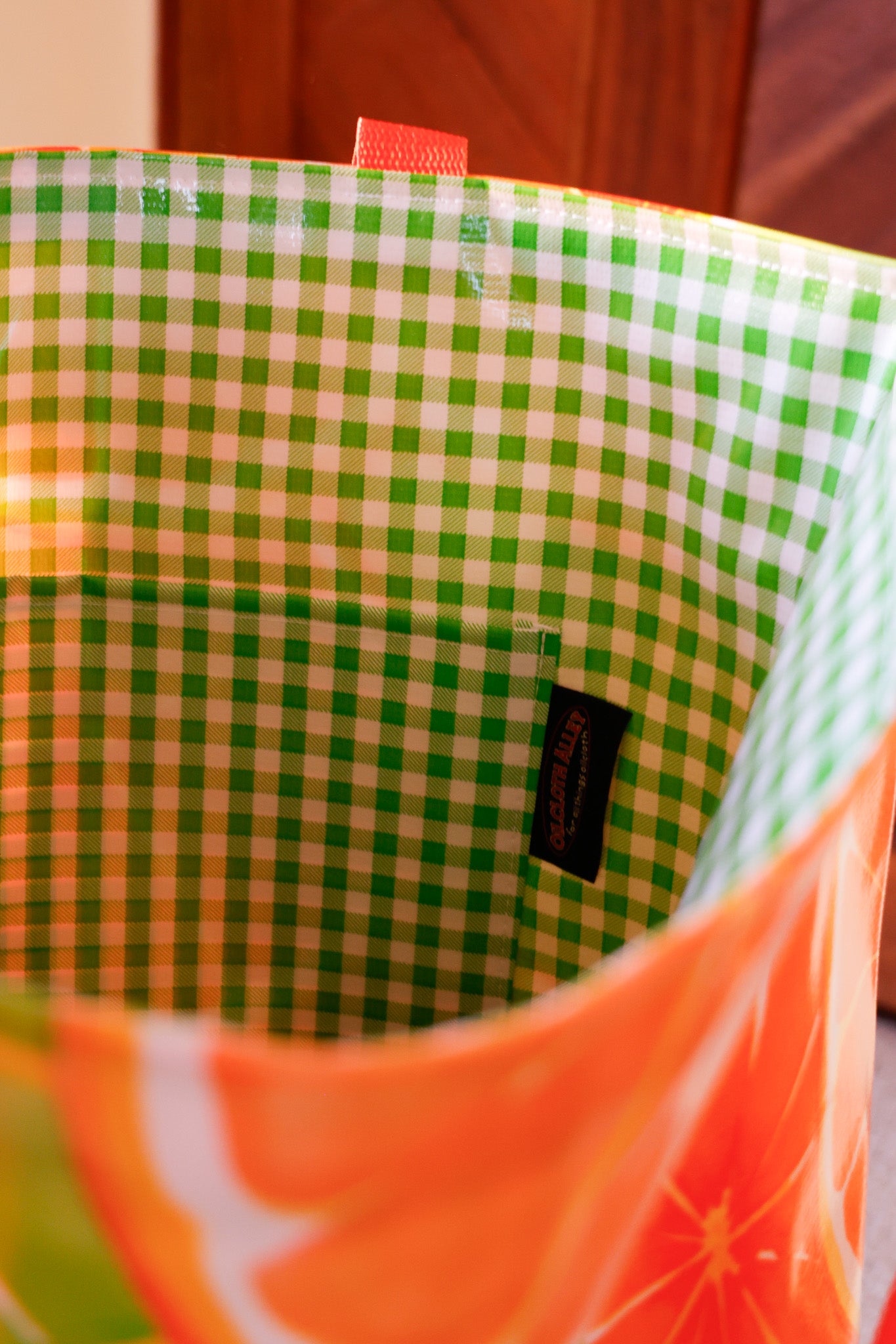 Our signature reversible tote bag will become your favorite bag to bring on the go! It's sturdy, stylish, and easy to clean, making it perfect for groceries, books, or anything you dream of toting around town! This juicy style combines an Orange and Green Citrus Spill with Green Gingham in two sizes: medium and large.