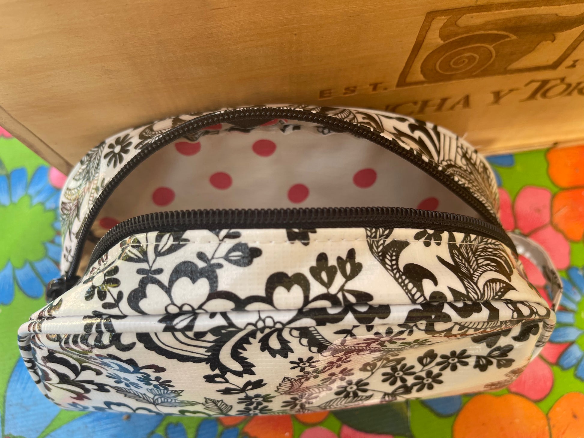 Calling all world travelers, this set is for you! Keep track of all those little things on the road with this set of three oilcloth bags. The Black and White Toile print is as beautiful as it is elegant, and will last practically forever! Features a mini and small Cosmetic bag, and a small pouch.