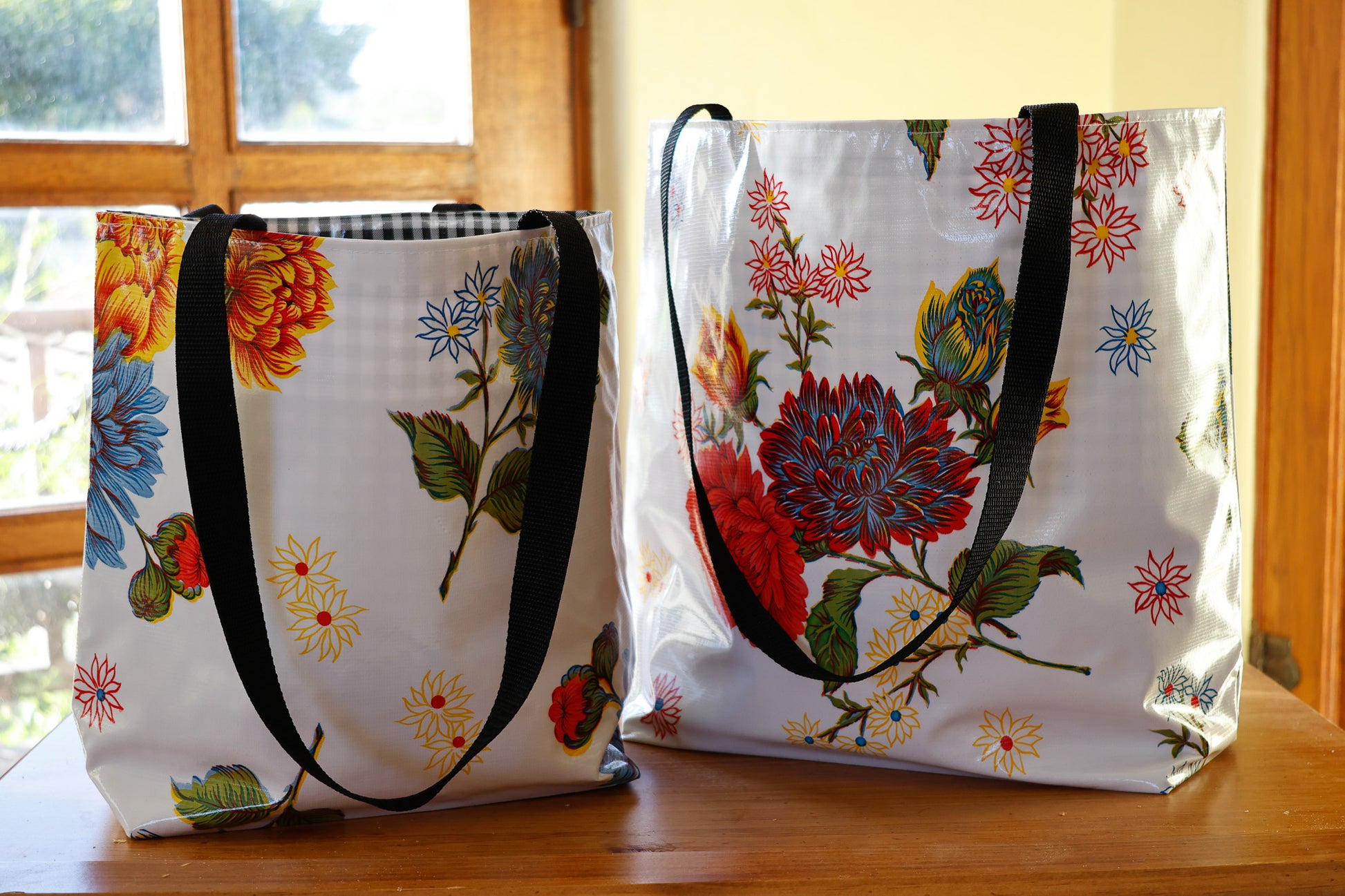 Reversible Oilcloth Totebag - White Mums with Black Gingham - Two Sizes